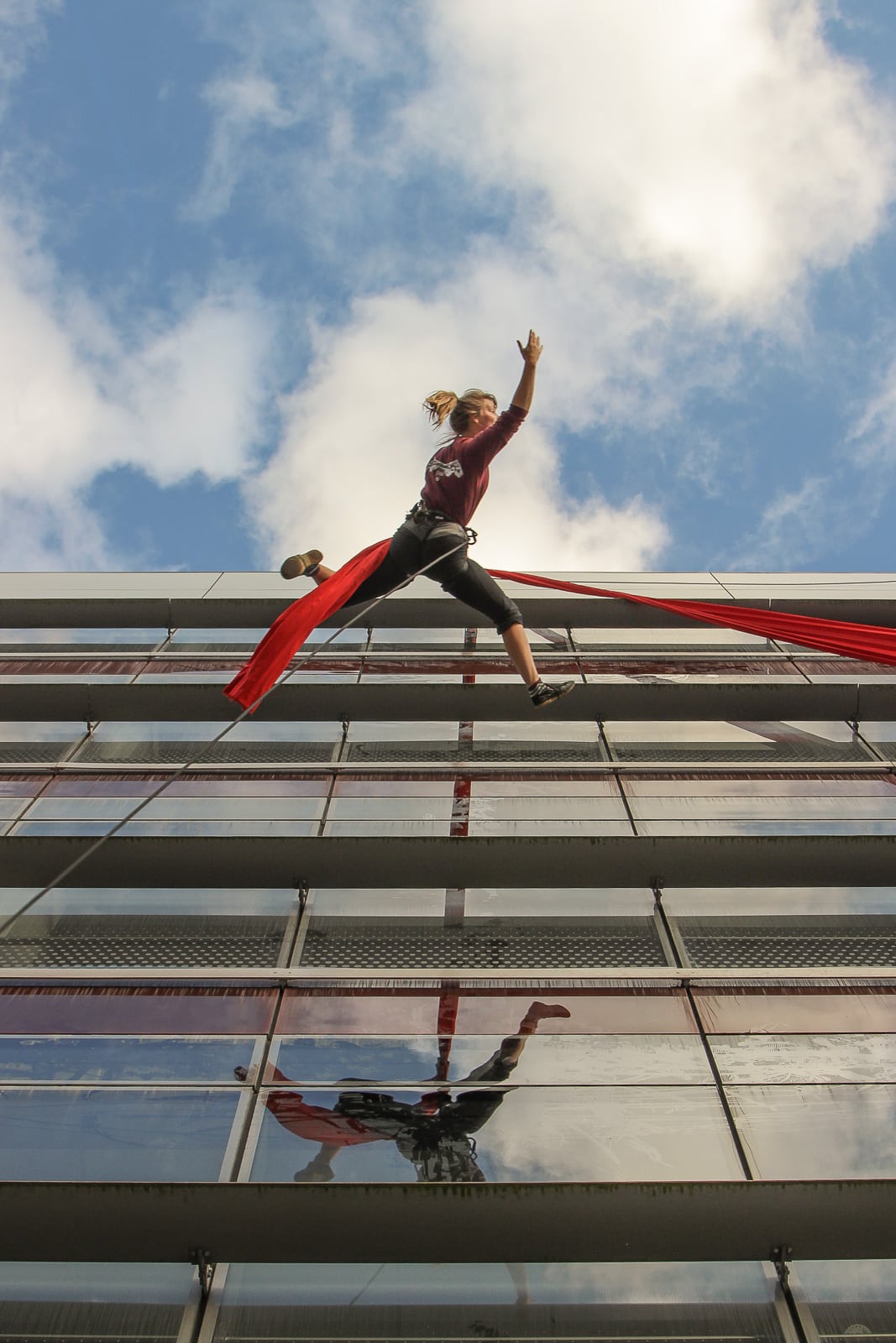 In 2016 Spraoi festival in Waterford, Ireland commissioned Fidget Feet to create a new vertical dance show, with live music. Using specially composed music and original choreography. The audience watched the sky as a musicician played live as flew down the side of a building. This piece can transform any urban building and give it wings and can be adapted to different buildings.